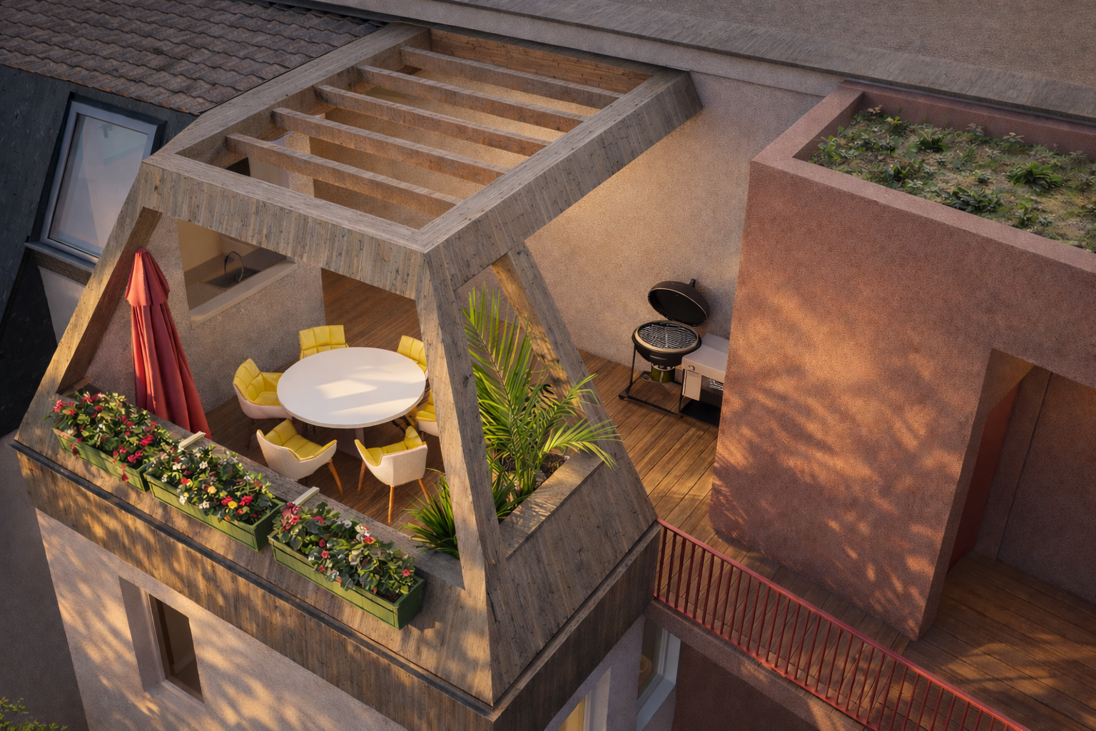 Mit dem Neubau im Garten, unserem zweiten Baugruppen-Projekt, teilen sich die Nestbewohner den Aufzug. Stimmt die Chemie, ist vielleicht auch eine anteilige Nutzung von deren gemeinschaftlichem Dachgeschoss nebst Gäste-Wohnung und Sauna denkbar.