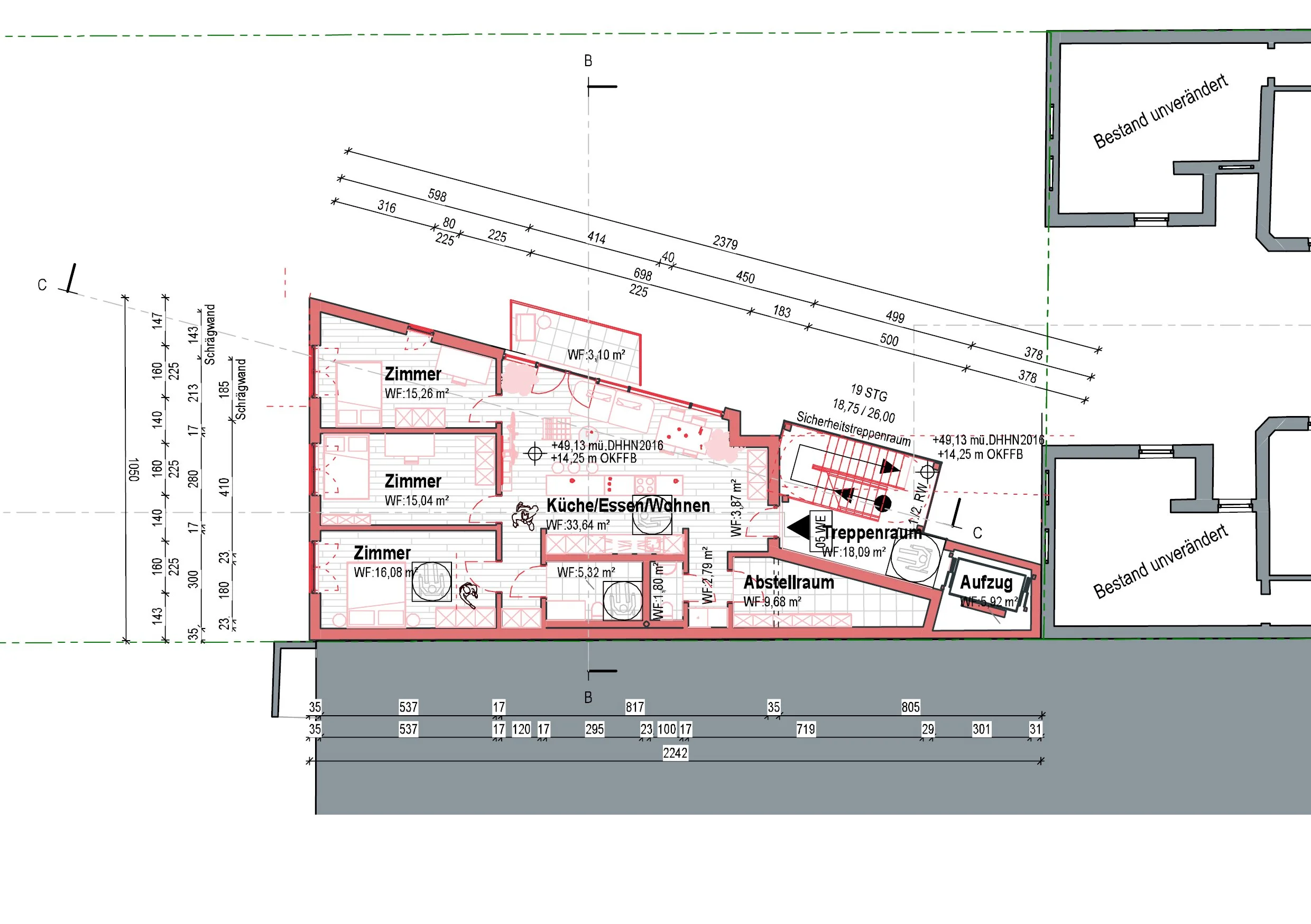 Alle Wohnungen bekommen eine großzügige Wohnküche mit anschließendem 6m² großem Balkon, drei Schlafzimmer, ein Badezimmern sowie ein Gäste-WC. Zusätzlich zur großen Abstellkammer gibt es ein Abteil im Keller. Der Fahrstuhl hält direkt auf der Etage, sodass die Wohnungen barrierefrei sind.