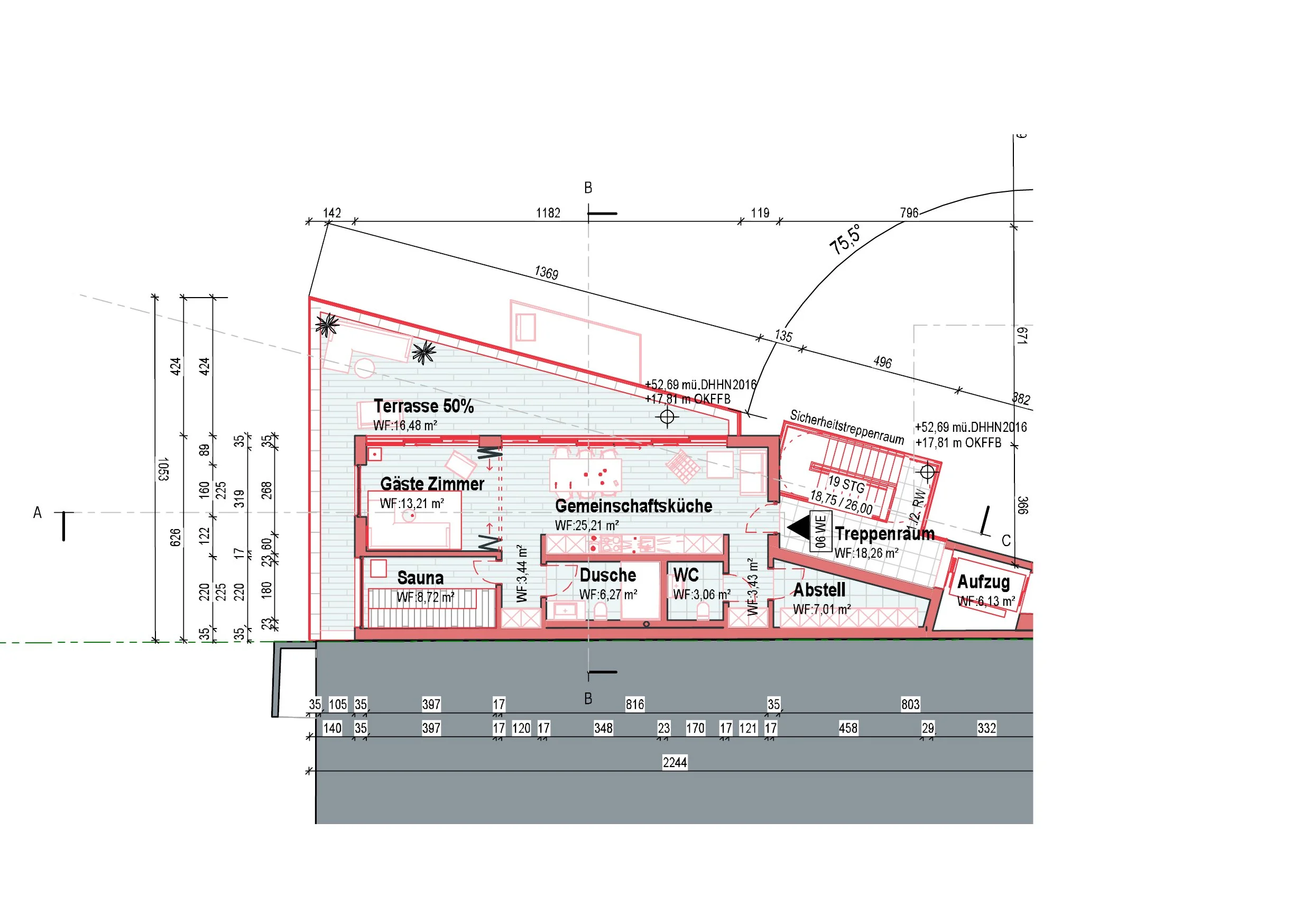 Die aktuelle Planung sieht fünf identische 4-Zimmer-Wohnungen mit je 110m² Wohnfläche vor. Zusätzlich teilen sich alle Bewohner das Dachgeschoss mit einer 30m² großen Sonnenterrasse, einem 30m² großen Gemeinschaftsraum, einer Gäste-Wohnung und einer Sauna.