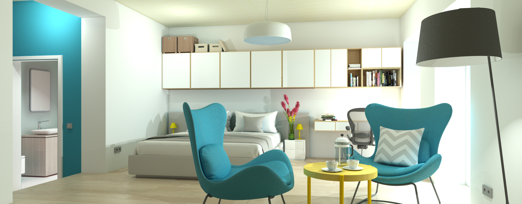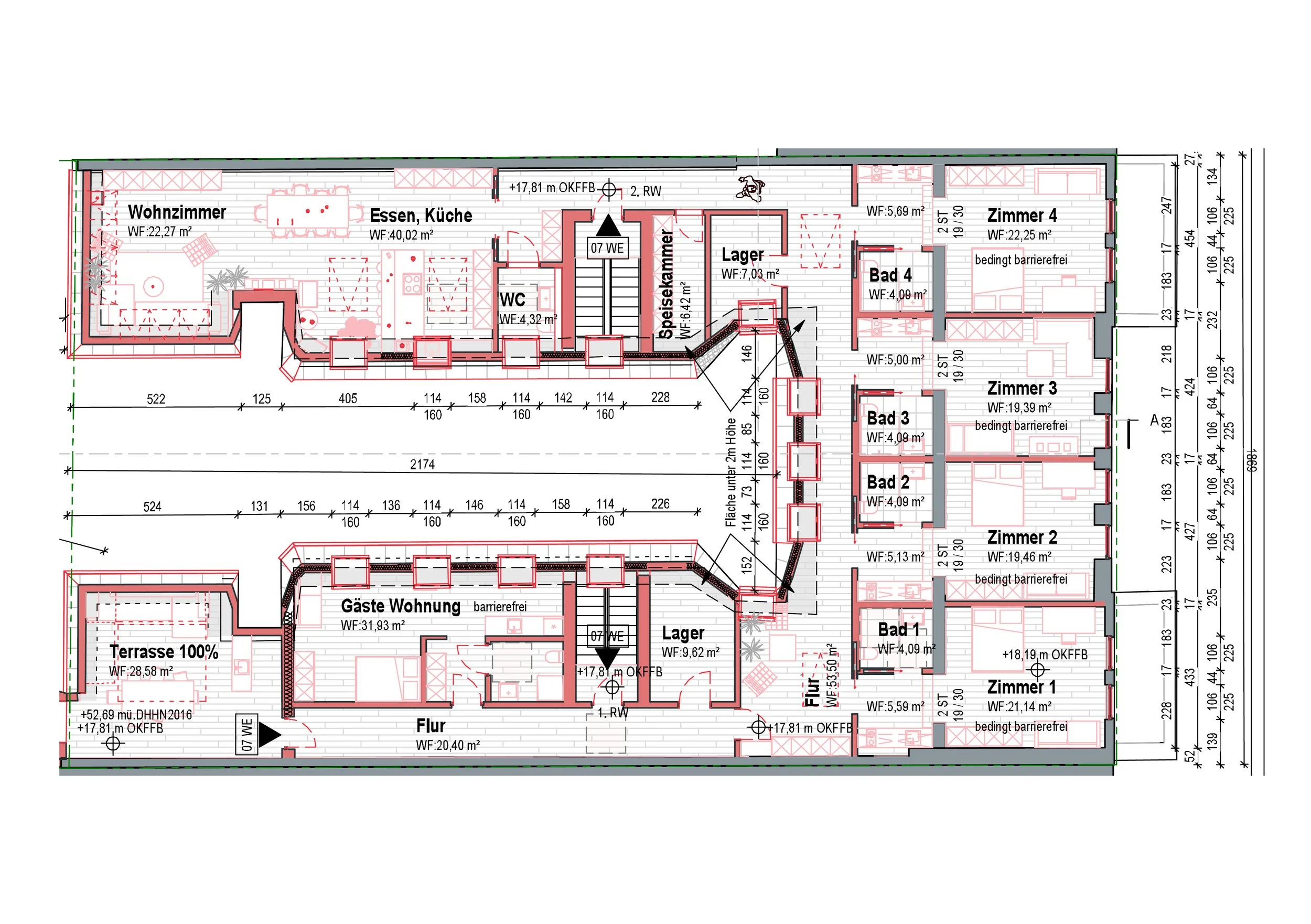 Die aktuelle Planung sieht vier beinahe identische Schlafzimmer vor mit jeweils einem privaten Badezimmer. Ein fünftes Zimmer könnte entweder ein Gästezimmer werden oder eine weitere Partei aufnehmen. Zusätzlich teilen sich alle Bewohner eine über 60m² Wohnküche mit Speisekammer und Lagerräumen sowie eine Terrasse.